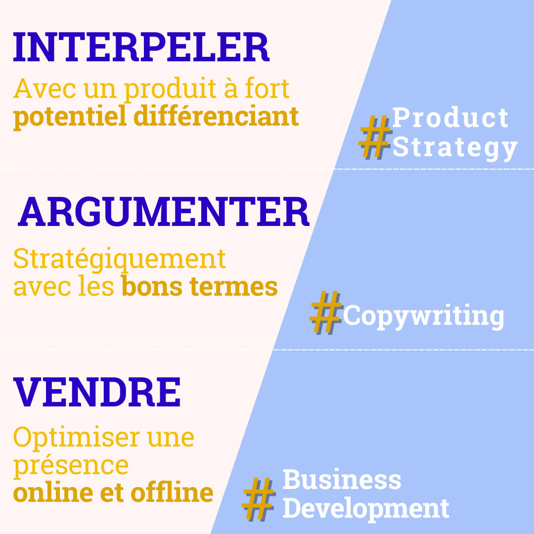 L'empathie pour une fine compréhension du public cibleLe naming pour styliser une plumeLe storytelling pour embarquerLe copywritting pour vendreEt enfin, l'analyse d'occurrences de requête, la longue traîne pour séduire les algorithmes.